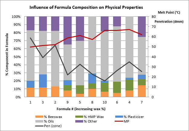 In Table 2 there are ten different formulas, each one with a very different texture. For each one we broke down the composition into beeswax, high melt point/hard gelling wax(es), plasticizer(s), and other ingredients. For each one, we recorded physical properties (formula hardness and melt point), as well as sensory attributes (glide, pickup/payout, tack, and creaminess).